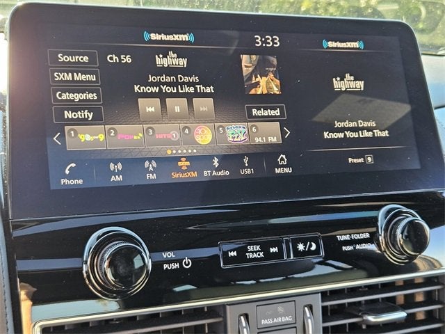 - Radio: NissanConnect w/SiriusXM -inc: 13-speaker Bose audio system, wireless Apple CarPlay, Android Auto, Nissan door to door navigation, 12.3" color display w/multi-touch control, SiriusXM Traffic and Travel Link w/three month complimentary trial access, NissanConnect Services powered by SiriusXM, Bluetooth® hands-free phone system, hands-free text messaging assistant and Wi-Fi hotspot